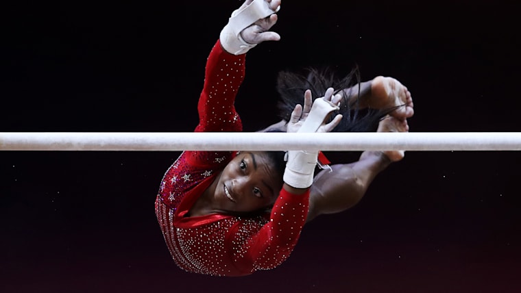 Simone Biles performs on the uneven bars during the team final at the 2018 Worlds