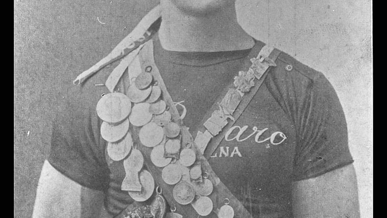 6-15 Jul 1912: Ralph Rose of the USA preparing to throw the shot during the Shot event at the 1912 Olympic Games in Stockholm, Sweden. Rose won the silver medal in this event. \ Mandatory Credit: IOC Olympic Museum /Allsport
