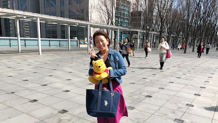 A Yuzuru Hanyu fan poses with a Pooh toy at the World Figure Skating Championships