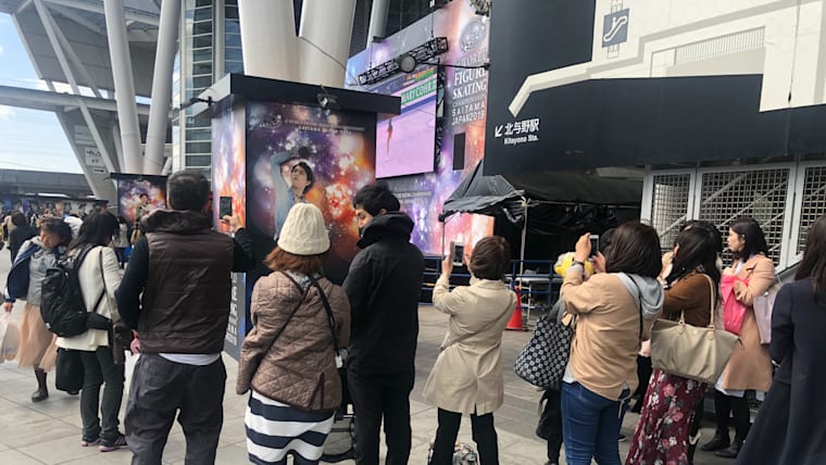 Fans taking photos of a Yuzuru Hanyu poster at the World Figure Skating Championships