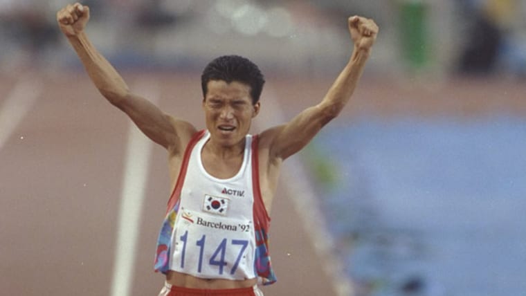 25 Jul-8 Aug 1992: Young-Cho Hwang of South Korea holds his arms aloft as he crosses the line to win the Marathon event during the 1992 Olympic Games at the Monjuic Stadium in Barcelona, Spain. Hwang won the gold medal with a time of 2:13:23 hours. \ Mandatory Credit: Chris Cole/Allsport