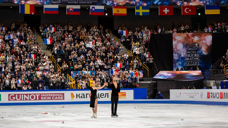 Gabriella Papadakis and Guillaume Cizeron of France acknowledge the crowd after their rhythm dance in Saitama