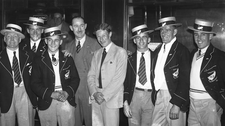 27th July 1936: New Zealand 1936 Olympic team including John Lovelock (centre) winner 1936 olympic 1500 metre gold medal and A E Porritt the Manager. (Photo by Hudson/Topical Press Agency/Getty Images)