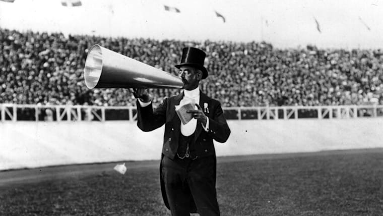 The City Toastmaster using a megaphone at the 1908 London Olympics. (Photo by Hulton Archive/Getty Images)