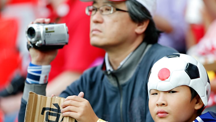 CARDIFF, WALES - AUGUST 03: Japan fans enjoying themselves during the Women's Football Quarter Final match between Brazil and Japan, on Day 7 of the London 2012 Olympic Games at Millennium Stadium on August 3, 2012 in Cardiff, Wales. (Photo by Mike Hewitt/Getty Images)