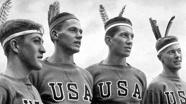 August 1936: Four American athletes wearing Indian headresses watching their fellow athletes at the 1936 Berlin Olympics. (Photo by Hulton Archive/Getty Images)
