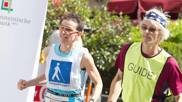 The Olympic Day. Race of the adults. A blind person running with the help of a guide.