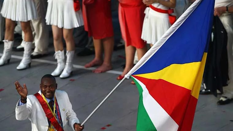 BEIJING - AUGUST 08: Badminton Georgie Cupidon of the Seychelles carries his nation's flag during the Opening Ceremony for the 2008 Beijing Summer Olympics at the National Stadium on August 8, 2008 in Beijing, China.