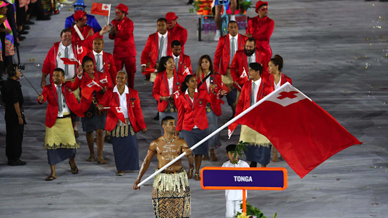 Flag Bearer Pita Nikolas AUFATOFUA of Tonga leads out his country during the Opening Ceremony of the Rio 2016 Olympic Games at Maracana Stadium, Rio de Janeiro, Brazil.