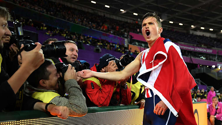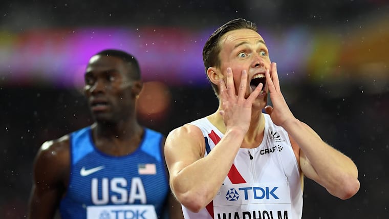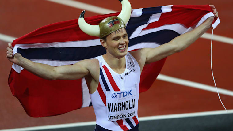 Karsten Warholm celebrates his 400m hurdles gold at the 2017 World Championships in London