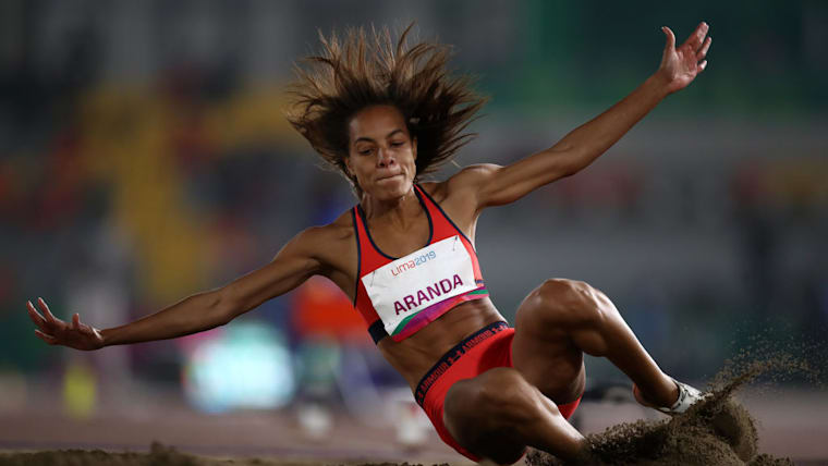LIMA, PERU - AUGUST 06: Nathalee Aranda of Panama jumps in Women's Long Jump Final on Day 11 of Lima 2019 Pan American Games at Athletics Stadium of Villa Deportiva Nacional on August 06, 2019 in Lima, Peru. (Photo by Ezra Shaw/Getty Images)