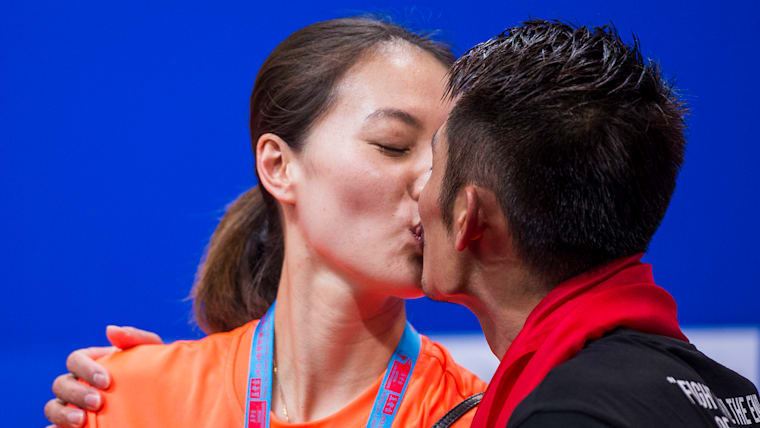 Lin Dan kisses his wife and double world champion Xie Xingfang after winning his fifth world men's singles title