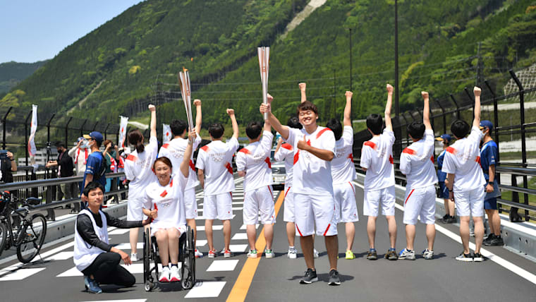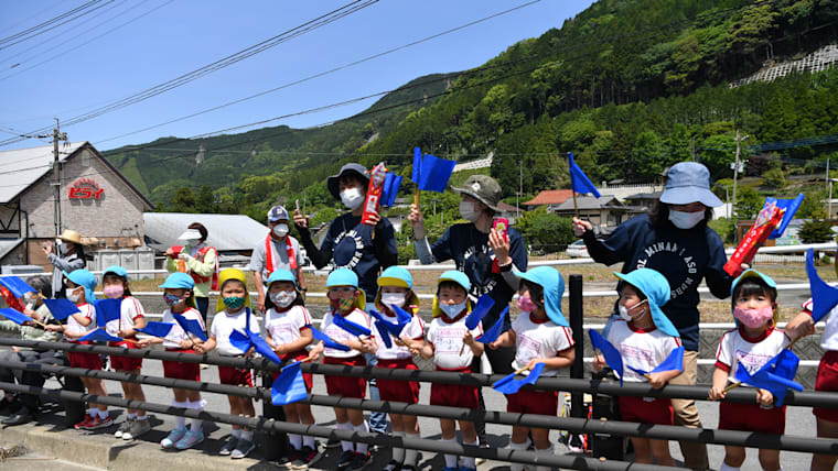 Kumamoto, JAPAN - 6 MAY 2021 : The Olympic Torch Relay section 2 in Minamiaso Village, Kumamoto prefecture, Japan.
