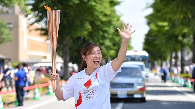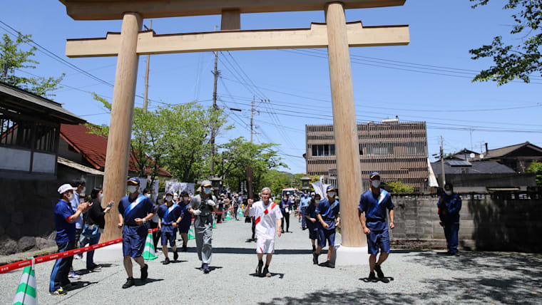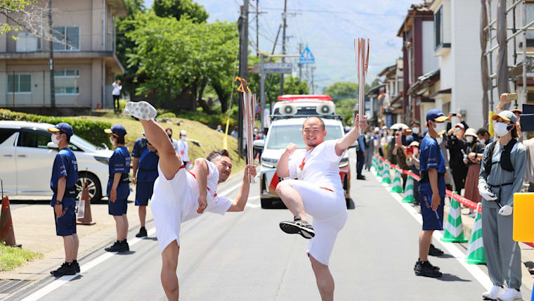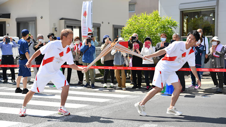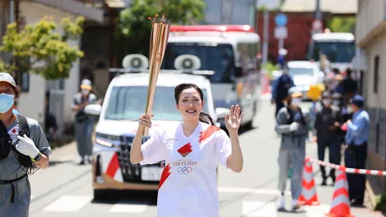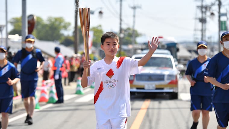 Kumamoto, JAPAN - 6 MAY 2021 : The Olympic Torch Relay section 3 in Aso City, Kumamoto prefecture, Japan.