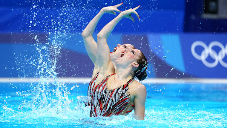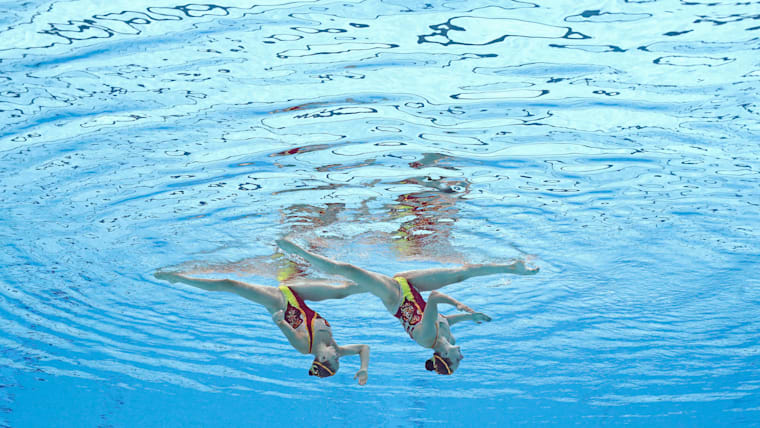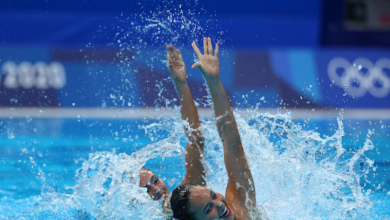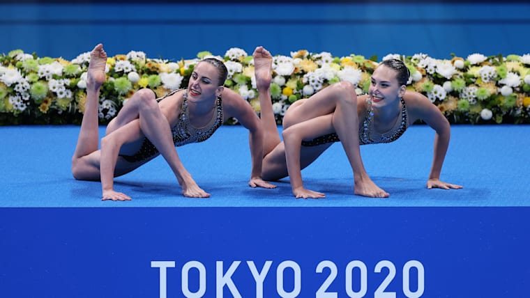 TOKYO, JAPAN - AUGUST 03: Alisa Ozhogina Ozhogin and Iris Tio Casas of Team Spain compete in the Artistic Swimming Duet Technical Routine on day eleven of the Tokyo 2020 Olympic Games at Tokyo Aquatics Centre on August 03, 2021 in Tokyo, Japan. (Photo by Clive Rose/Getty Images)