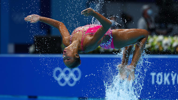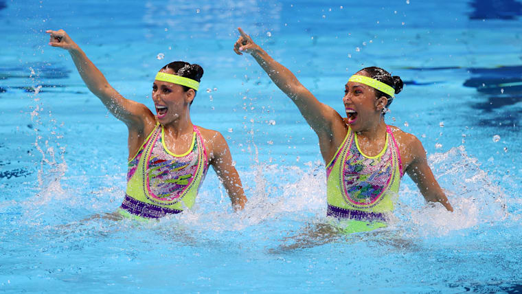 TOKYO, JAPAN - AUGUST 03: Nuria Diosdado and Joana Jimenez of Team Mexico compete in the Artistic Swimming Duet Technical Routine on day eleven of the Tokyo 2020 Olympic Games at Tokyo Aquatics Centre on August 03, 2021 in Tokyo, Japan. (Photo by Al Bello/Getty Images)