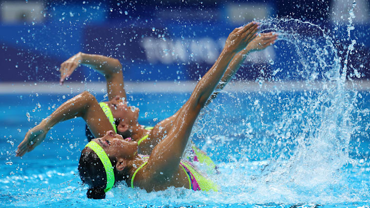 TOKYO, JAPAN - AUGUST 03: Estefania Alvarez Piedrahita and Monica Arango Estrada of Team Colombia compete in the Artistic Swimming Duet Technical Routine on day eleven of the Tokyo 2020 Olympic Games at Tokyo Aquatics Centre on August 03, 2021 in Tokyo, Japan. (Photo by Clive Rose/Getty Images)