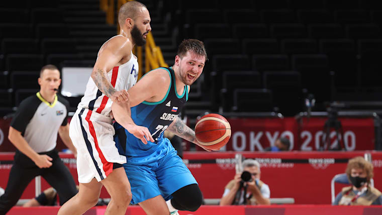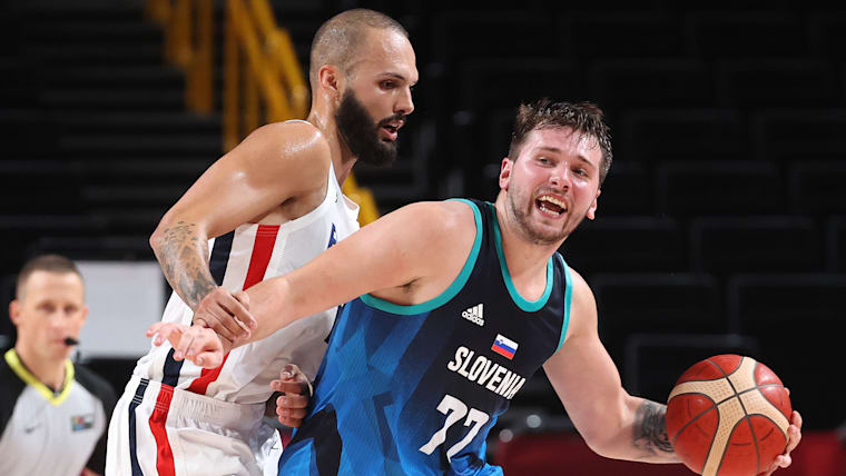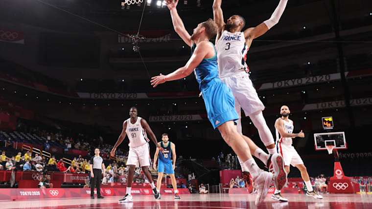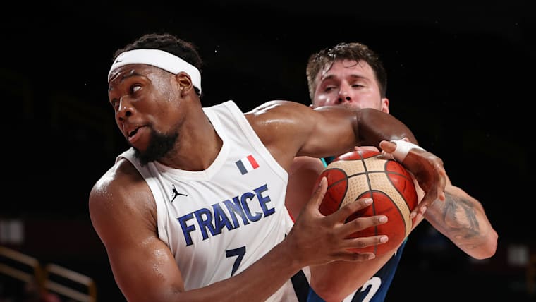 SAITAMA, JAPAN - AUGUST 05: Guerschon Yabusele #7 of Team France drives to the basket against Luka Doncic #77 of Team Slovenia during the second half of a Men's Basketball semi-finals game on day thirteen of the Tokyo 2020 Olympic Games at Saitama Super Arena on August 05, 2021 in Saitama, Japan. (Photo by Kevin C. Cox/Getty Images)