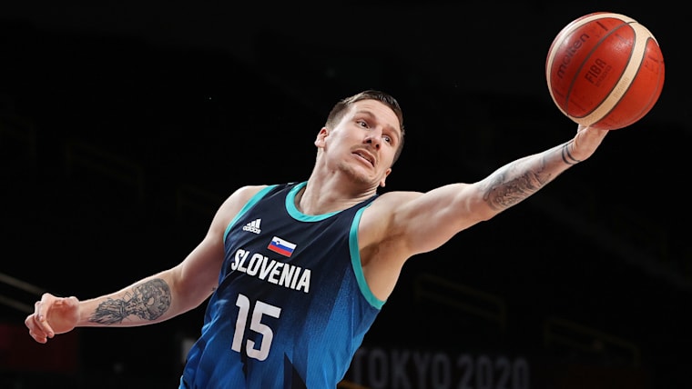 SAITAMA, JAPAN - AUGUST 05: Vlatko Cancar #31 of Team Slovenia drives to the basket against Team France during the second half of a Men's Basketball semi-finals game on day thirteen of the Tokyo 2020 Olympic Games at Saitama Super Arena on August 05, 2021 in Saitama, Japan. (Photo by Gregory Shamus/Getty Images)