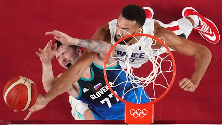 SAITAMA, JAPAN - AUGUST 05: Rudy Gobert #27 of Team France goes up for a rebound against Luka Doncic #77 of Team Slovenia during the second half of a Men's Basketball semi-finals game on day thirteen of the Tokyo 2020 Olympic Games at Saitama Super Arena on August 05, 2021 in Saitama, Japan. (Photo by Bryan Snyder - Pool/Getty Images)
