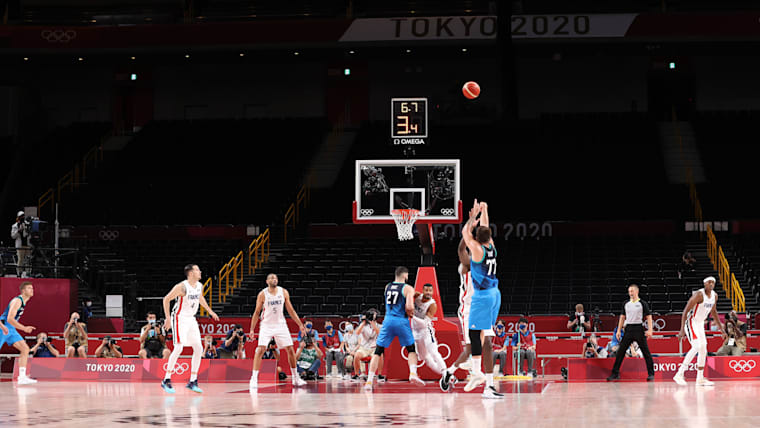 SAITAMA, JAPAN - AUGUST 05: Luka Doncic #77 of Team Slovenia shoots against Team France during the second half of a Men's Basketball semi-finals game on day thirteen of the Tokyo 2020 Olympic Games at Saitama Super Arena on August 05, 2021 in Saitama, Japan. (Photo by Gregory Shamus/Getty Images)