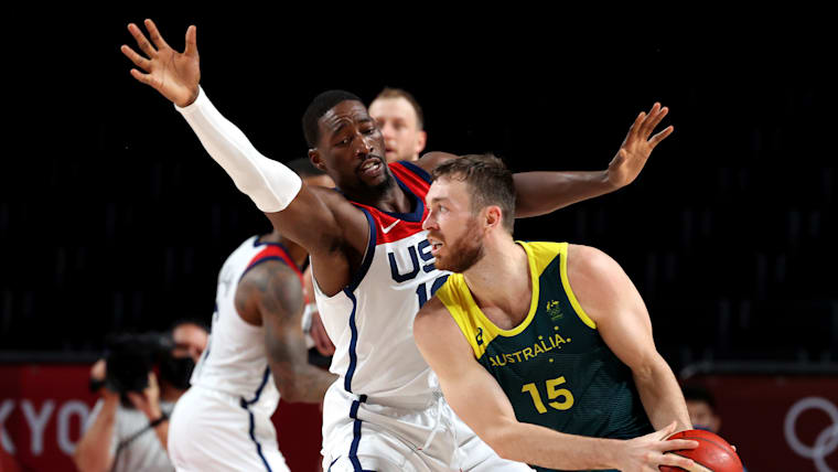 SAITAMA, JAPAN - AUGUST 05: Nic Kay #15 of Team Australia reacts against Team United States during the first half of a Men's Basketball quarterfinals game on day thirteen of the Tokyo 2020 Olympic Games at Saitama Super Arena on August 05, 2021 in Saitama, Japan. (Photo by Kevin C. Cox/Getty Images)