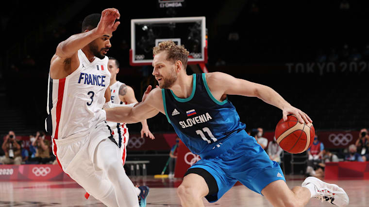 SAITAMA, JAPAN - AUGUST 05: Jaka Blazic #11 of Team Slovenia drives to the basket against Timothe Luwawu Kongbo #3 of Team France during the first half of a Men's Basketball semi-finals game on day thirteen of the Tokyo 2020 Olympic Games at Saitama Super Arena on August 05, 2021 in Saitama, Japan. (Photo by Kevin C. Cox/Getty Images)