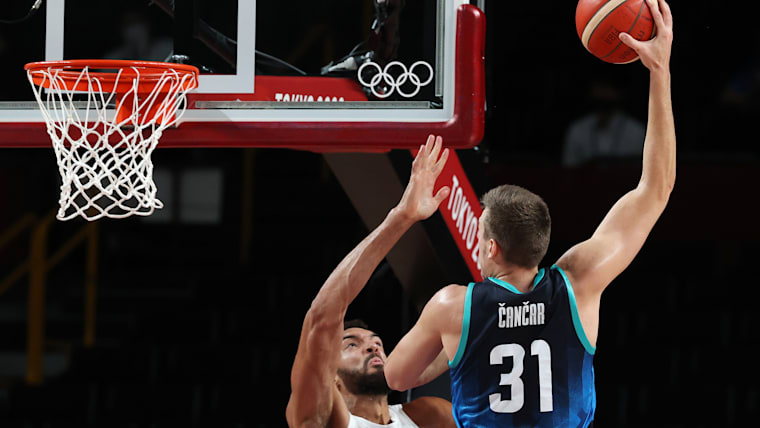 SAITAMA, JAPAN - AUGUST 05: Vlatko Cancar #31 of Team Slovenia goes up for a dunk against Rudy Gobert #27 of Team France during the second half of a Men's Basketball semi-finals game on day thirteen of the Tokyo 2020 Olympic Games at Saitama Super Arena on August 05, 2021 in Saitama, Japan. (Photo by Kevin C. Cox/Getty Images)
