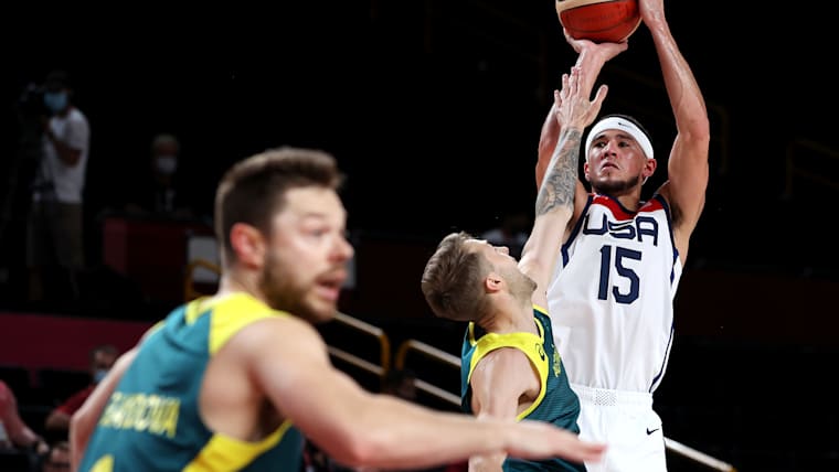 SAITAMA, JAPAN - AUGUST 05: Devin Booker #15 of Team United States shoots over Nathan Sobey #9 of Team Australia during the second half of a Men's Basketball quarterfinals game on day thirteen of the Tokyo 2020 Olympic Games at Saitama Super Arena on August 05, 2021 in Saitama, Japan. (Photo by Kevin C. Cox/Getty Images)