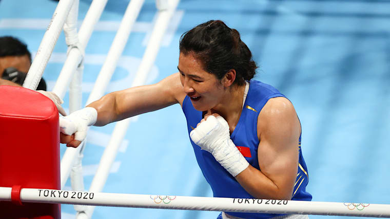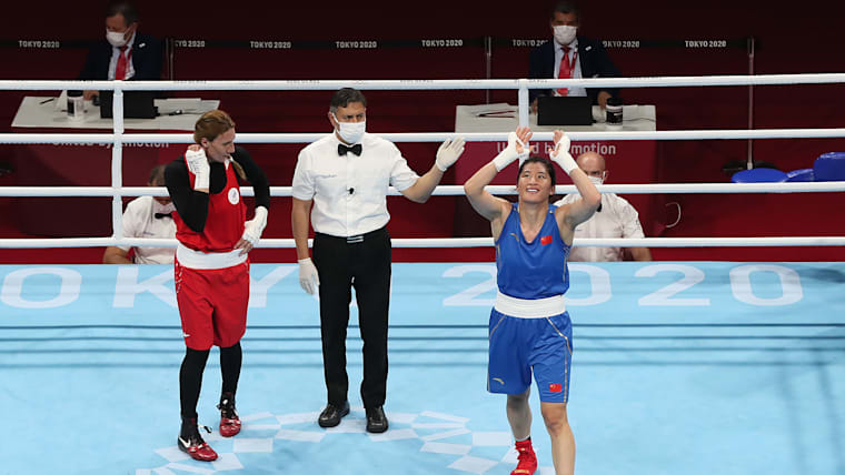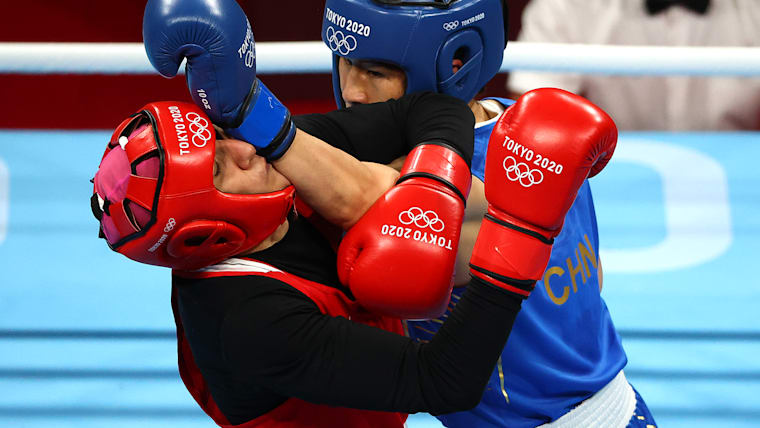 TOKYO, JAPAN - AUGUST 06: Zenfira Magomedalieva of Team ROC (red) exchanges punches with Qian Li of Team China during the Women's Middle (69-75kg) Semifinal 2 on day fourteen of the Tokyo 2020 Olympic Games at Kokugikan Arena on August 06, 2021 in Tokyo, Japan. (Photo by Buda Mendes/Getty Images)