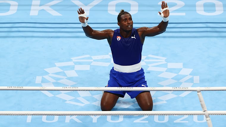 TOKYO, JAPAN - AUGUST 06: Julio La Cruz of Team Cuba (blue) celebrates defeating Muslim Gadzhimagomedov of Team ROC during the Men's Heavy (81-91kg) Final Bout on day fourteen of the Tokyo 2020 Olympic Games at Kokugikan Arena on August 06, 2021 in Tokyo, Japan. (Photo by Buda Mendes/Getty Images)