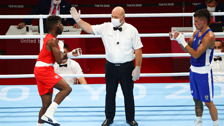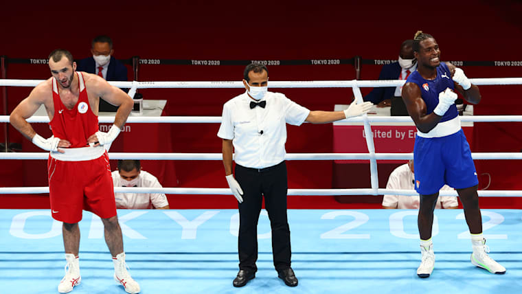 TOKYO, JAPAN - AUGUST 06: Andy Cruz of Team Cuba (red) is declared the winner after his bout with Harry Garside of Team Australia during the Men's Light (57-63kg) Semifinal 2 on day fourteen of the Tokyo 2020 Olympic Games at Kokugikan Arena on August 06, 2021 in Tokyo, Japan. (Photo by Buda Mendes/Getty Images)