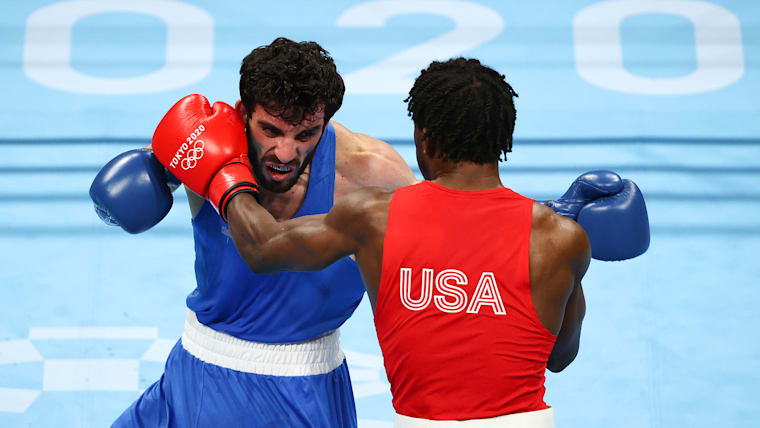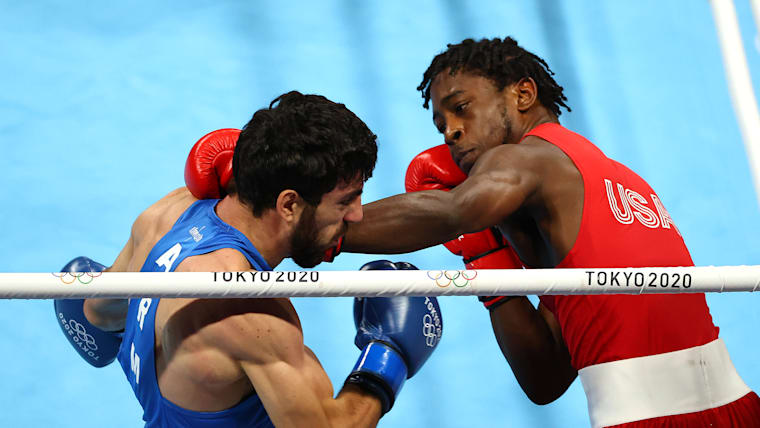 TOKYO, JAPAN - AUGUST 06: Keyshawn Davis of Team United States (red) exchanges punches with Hovhannes Bachkov of Team Armenia during the Men's Light (57-63kg) Semifinal 1 on day fourteen of the Tokyo 2020 Olympic Games at Kokugikan Arena on August 06, 2021 in Tokyo, Japan. (Photo by Buda Mendes/Getty Images)