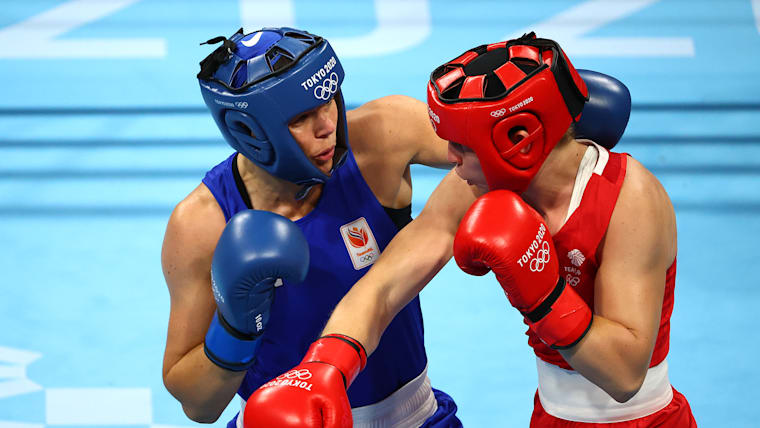 TOKYO, JAPAN - AUGUST 06: Lauren Price of Team Great Britain (red) exchanges punches with Nouchka Fontijn of Team Netherlands during the Women's Middle (69-75kg) Semifinal 1 on day fourteen of the Tokyo 2020 Olympic Games at Kokugikan Arena on August 06, 2021 in Tokyo, Japan. (Photo by Buda Mendes/Getty Images)