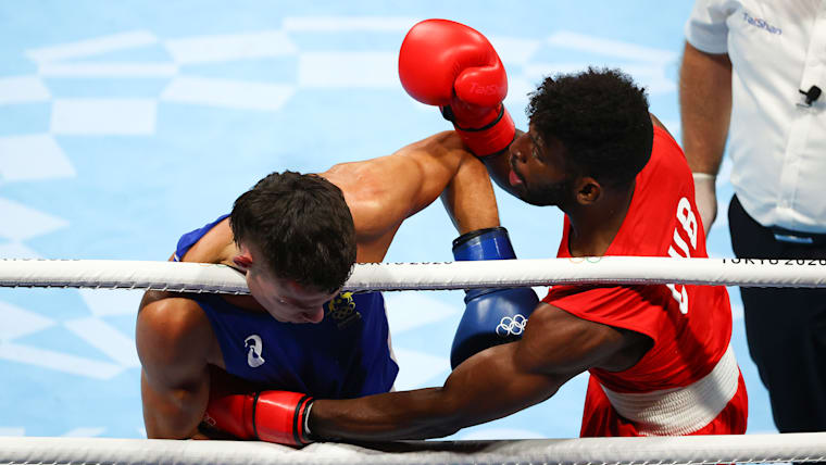 TOKYO, JAPAN - AUGUST 06: Andy Cruz of Team Cuba (red) exchanges punches with Harry Garside of Team Australia during the Men's Light (57-63kg) Semifinal 2 on day fourteen of the Tokyo 2020 Olympic Games at Kokugikan Arena on August 06, 2021 in Tokyo, Japan. (Photo by Buda Mendes/Getty Images)