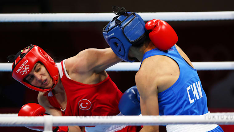TOKYO, JAPAN - AUGUST 07: Busenaz Surmeneli of Team Turkey punches Hong Gu of Team China during the Women's Welter (64-69kg) Final bout between Busenaz Surmeneli of Team Turkey and Hong Gu of Team China on day fifteen of the Tokyo 2020 Olympic Games at Kokugikan Arena on August 07, 2021 in Tokyo, Japan. (Photo by Buda Mendes/Getty Images)