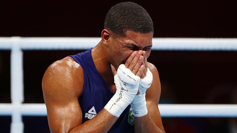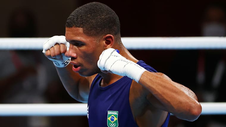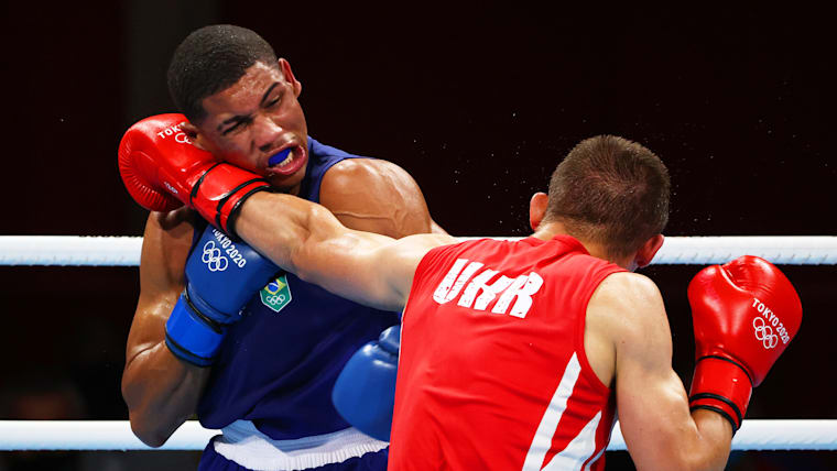 TOKYO, JAPAN - AUGUST 07: Herbert Sousa of Team Brazil punches Oleksandr Khyzhniak of Team Ukraine during the Men's Middle (69-75kg) Final bout between Oleksandr Khyzhniak of Team Ukraine and Herbert Sousa of Team Brazil on day fifteen of the Tokyo 2020 Olympic Games at Kokugikan Arena on August 07, 2021 in Tokyo, Japan. (Photo by Buda Mendes/Getty Images)