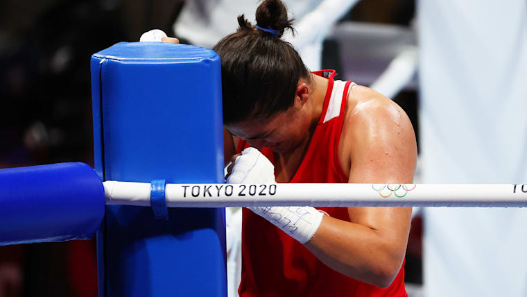 TOKYO, JAPAN - AUGUST 07: Stoyka Zhelyazkova Krasteva of Team Bulgaria holds on to Buse Naz Cakiroglue of Team Turkey during the Women's Fly (48-51kg) Final bout between Buse Naz Cakiroglue of Team Turkey and Stoyka Zhelyazkova Krasteva of Team Bulgaria on day fifteen of the Tokyo 2020 Olympic Games at Kokugikan Arena on August 07, 2021 in Tokyo, Japan. (Photo by Buda Mendes/Getty Images)