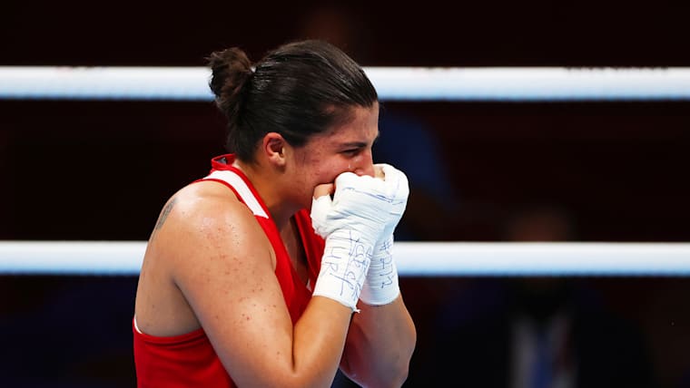 TOKYO, JAPAN - AUGUST 07: Busenaz Surmeneli of Team Turkey reacts to victory and winning a gold medal during the Women's Welter (64-69kg) Final bout between Busenaz Surmeneli of Team Turkey and Hong Gu of Team China on day fifteen of the Tokyo 2020 Olympic Games at Kokugikan Arena on August 07, 2021 in Tokyo, Japan. (Photo by Buda Mendes/Getty Images)