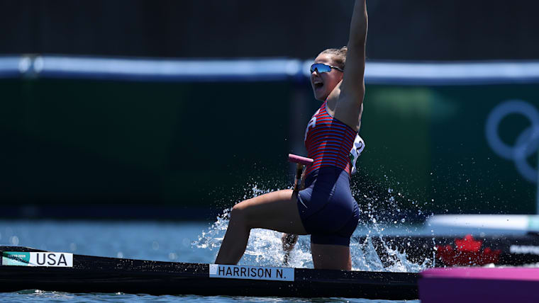TOKYO, JAPAN - AUGUST 05: Nevin Harrison of Team United States reacts to winning the gold medal in the Women's Canoe Single 200m Final A on day thirteen of the Tokyo 2020 Olympic Games at Sea Forest Waterway on August 05, 2021 in Tokyo, Japan. (Photo by Naomi Baker/Getty Images)