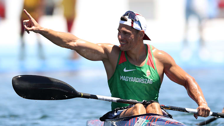 TOKYO, JAPAN - AUGUST 05: Sandor Totka of Team Hungary celebrates winning the gold medal in the Men's Kayak Single 200m Final A on day thirteen of the Tokyo 2020 Olympic Games at Sea Forest Waterway on August 05, 2021 in Tokyo, Japan. (Photo by Laurence Griffiths/Getty Images)