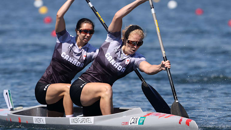 TOKYO, JAPAN - AUGUST 06: Laurence Vincent-Lapointe and Katie Vincent of Team Canada compete during the Women's Canoe Double 500m Heat 1 on day fourteen of the Tokyo 2020 Olympic Games at Sea Forest Waterway on August 06, 2021 in Tokyo, Japan. (Photo by Phil Walter/Getty Images)
