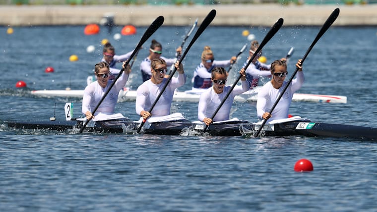 TOKYO, JAPAN - AUGUST 06: Lisa Carrington, Alicia Hoskin, Caitlin Regal and Teneale Hatton of Team New Zealand compete during the Women's Kayak Four 500m Heat 1 on day fourteen of the Tokyo 2020 Olympic Games at Sea Forest Waterway on August 06, 2021 in Tokyo, Japan. (Photo by Phil Walter/Getty Images)