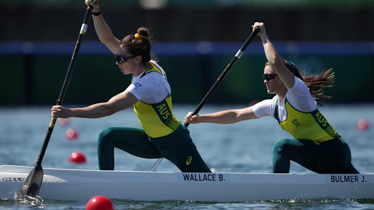 TOKYO, JAPAN - AUGUST 06: Bernadette Wallace and Josephine Bulmer of Team Australia compete during the Women's Canoe Double 500m Heat 1 on day fourteen of the Tokyo 2020 Olympic Games at Sea Forest Waterway on August 06, 2021 in Tokyo, Japan. (Photo by Adam Pretty/Getty Images)