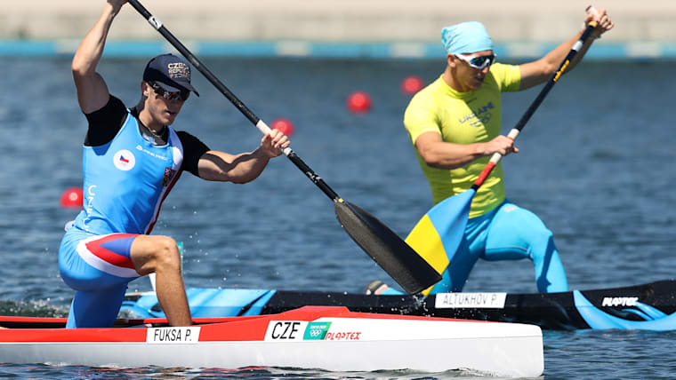 TOKYO, JAPAN - AUGUST 06: Martin Fuksa of Team Czech Republic races Pavlo Altukhov of Team Ukraine during the Men's Canoe Single 1000m Heat 3 on day fourteen of the Tokyo 2020 Olympic Games at Sea Forest Waterway on August 06, 2021 in Tokyo, Japan. (Photo by Phil Walter/Getty Images)