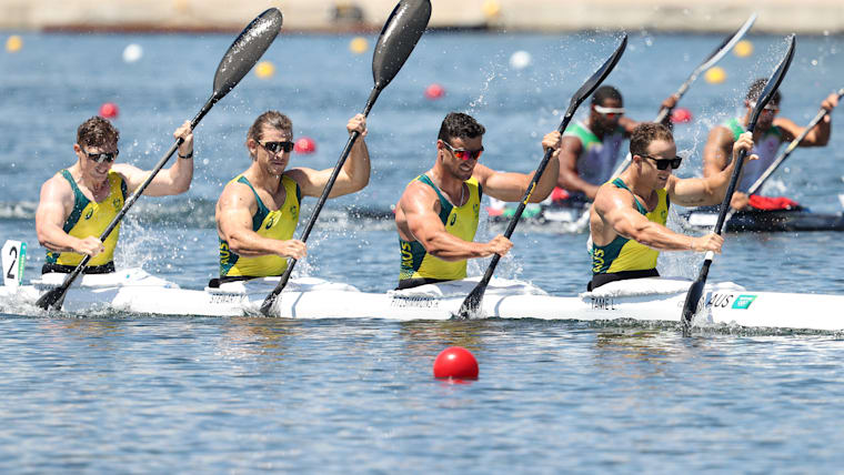 TOKYO, JAPAN - AUGUST 06: Lachlan Tame, Riley Fitzsimmons, Murray Stewart and Jordan Wood of Team Australia competes during the Men's Kayak Four 500m Heat 1 on day fourteen of the Tokyo 2020 Olympic Games at Sea Forest Waterway on August 06, 2021 in Tokyo, Japan. (Photo by Phil Walter/Getty Images)