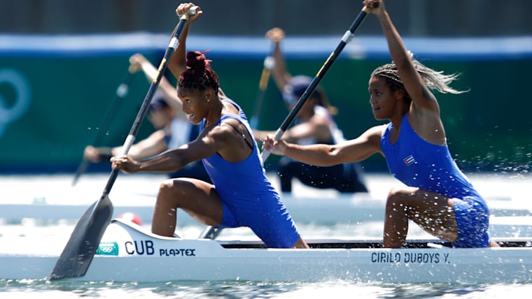 TOKYO, JAPAN - AUGUST 06: Yarisleidis Cirilo Duboys and Katherin Nuevo Segura of Team Cuba compete during the Women's Canoe Double 500m Quarterfinal 2 on day fourteen of the Tokyo 2020 Olympic Games at Sea Forest Waterway on August 06, 2021 in Tokyo, Japan. (Photo by Adam Pretty/Getty Images)