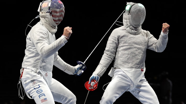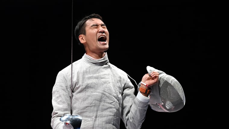 CHIBA, JAPAN - JULY 24: Junghwan Kim of Team South Korea celebrates after defeating Eli Dershwitz of Team United States on day one of the Tokyo 2020 Olympic Games at Makuhari Messe Hall on July 24, 2021 in Chiba, Japan. (Photo by Matthias Hangst/Getty Images)