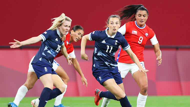 SAPPORO, JAPAN - JULY 21: Caroline Weir #11 of Team Great Britain runs with the ball whilst under pressure from Jose Urrutia Maria #9 of Team Chile during the Women's First Round Group E match between Great Britain and Chile during the Tokyo 2020 Olympic Games at Sapporo Dome on July 21, 2021 in Sapporo, Hokkaido, Japan. (Photo by Masashi Hara/Getty Images)