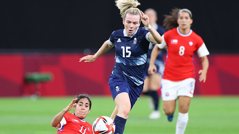 SAPPORO, JAPAN - JULY 21: Lauren Hemp #15 of Team Great Britain is challenged by Yessenia Lopez #11 of Team Chile during the Women's First Round Group E match between Great Britain and Chile during the Tokyo 2020 Olympic Games at Sapporo Dome on July 21, 2021 in Sapporo, Hokkaido, Japan. (Photo by Masashi Hara/Getty Images)